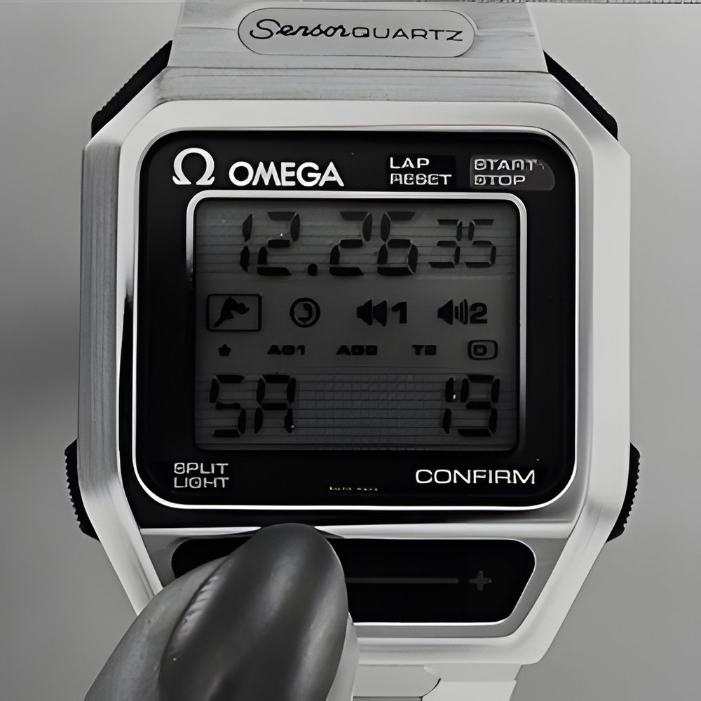 Multimemory LCD watch with microprocessor. In steel or gold plate. The most complete, most perfected watch of its kind. Continuous display of hour, minute, second. Plus nine simultaneously useable programmes, controlled by “sensor”: for selecting, programming, adjusting, by a simple stroke of the fingertip. Towards the right to increase the quantity of the data, towards the left to decrease it. Fast (hours. months) or slowly (minutes, dates). The direction and the speed of each movement are “understood” by the watch, and the command is transmitted to the microprocessor. 12-digit display, nine symbols, two sound signals. Tempered mineral crystal. Water-resistant to 30 meters. Registered model. (OMEGA Sensor Quartz)
