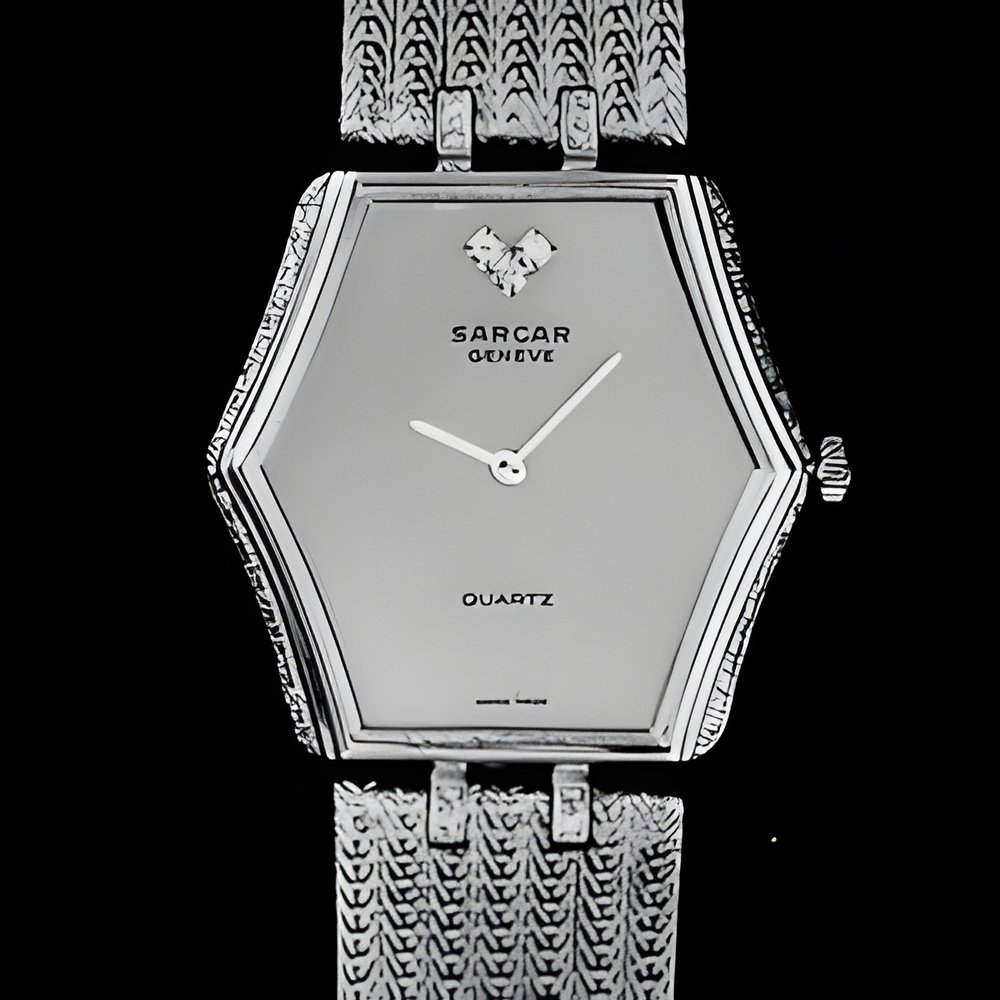 A Sarcar design of unabashed originality : case shape, bracelet attachments, fine-link woven bracelet, three diamonds at 12 o’clock... In 18K white gold, set with brilliant-cut diamonds. Extra-thin 9-line quartz movement. (SARCAR - Vivaldi Collection)