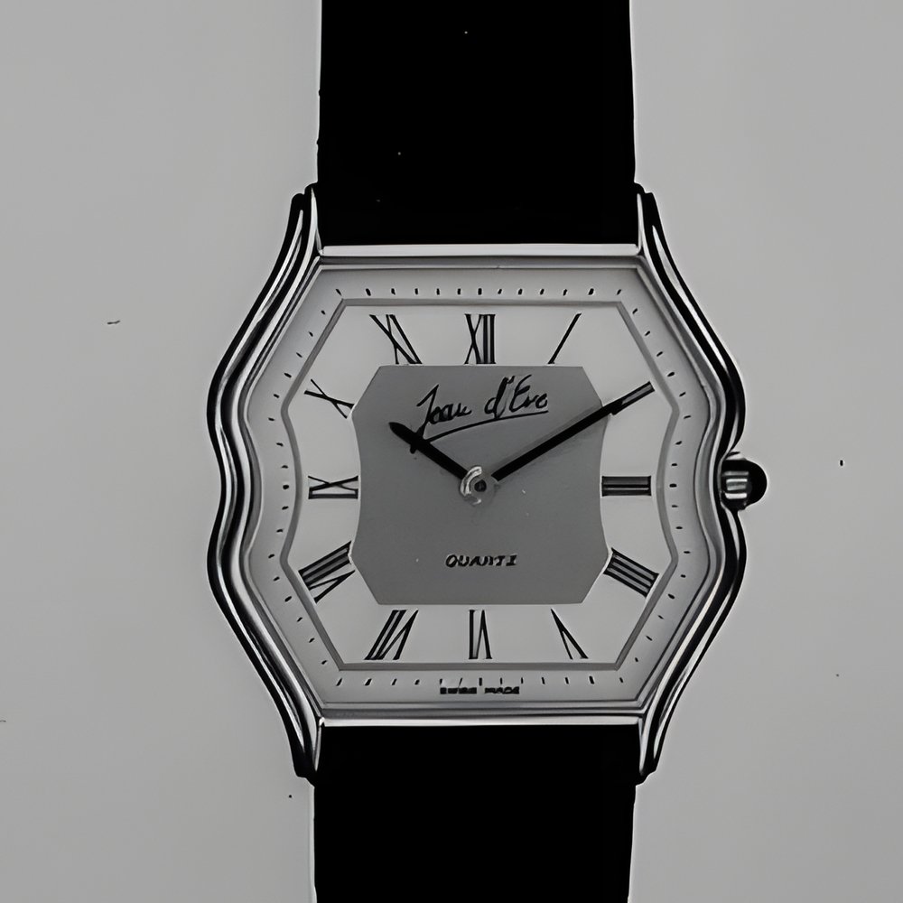 A model with turn-of-the-century look. The cases’ lateral godroons are “Eros’s Bow” shaped while the two-tone goidpiated dial features Roman numerals. The movement, however, is an ultramodern extra-thin quartz design. An exclusive LE PHARE creation sold under the “Jean d’Eve” name.