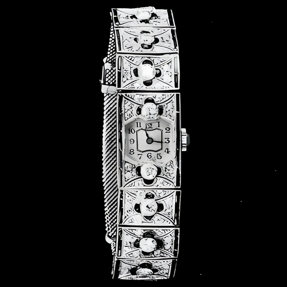 A return to turn-of-the-century styling : the case is platinum, engraved by hand and set with 8 full-cut diamonds (1,20 carats) and baguette-cut and half-moon-cut blue sapphires. The dial features a period style minute track. (LEONARD)