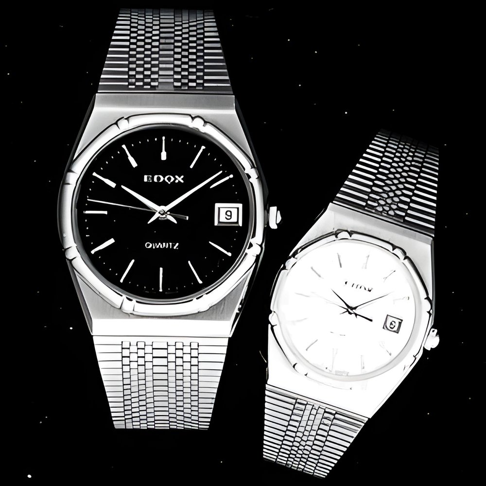 A pair of sporty watches with case water-resistant to 30 m, centre seconds, calendar and quartz-piloted movement. Their stainless steel bracelet flows stylishly into the case. A finely decorated bezel (in steel or goldplated steel) frames dials with applied markers. ([DUX)