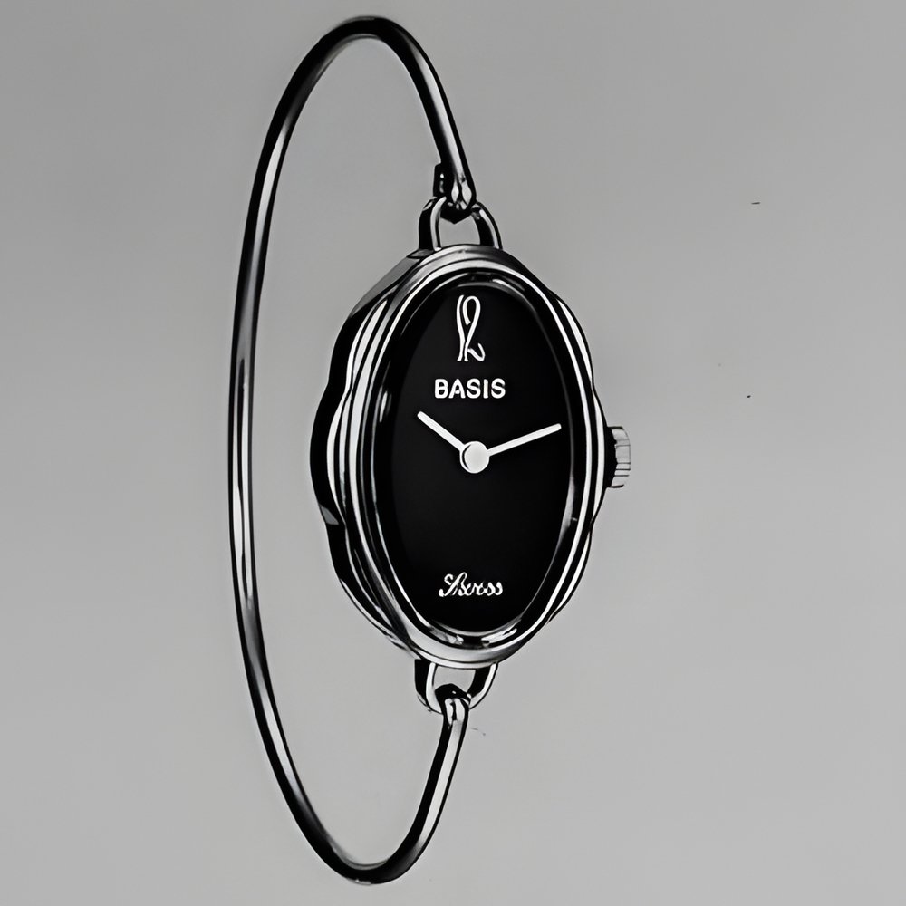 A youthfully styled design with fluted oval case and slim, rigid bracelet. It is fitted with a handwound 6 3/4 x 8" mechanical movement. (BASIS)