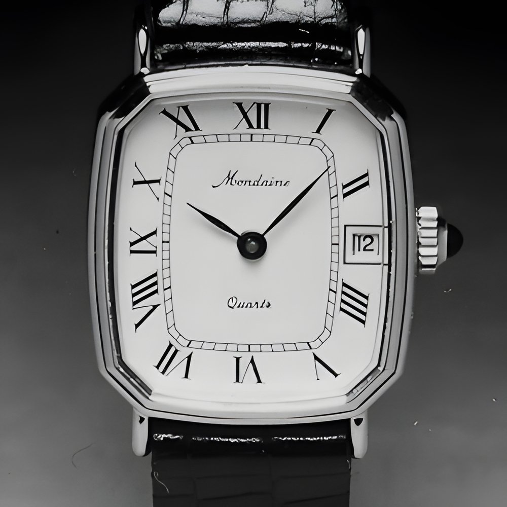 A softly styled eight-sided case sets off this very fashionable and thin wristwatch with enamelled dial featuring Roman numerals. Quartzpiloted movement, with calendar. The high quality leather strap comes from Mondaine’s new factory in Brazil. (MONDAINE EHA-52)