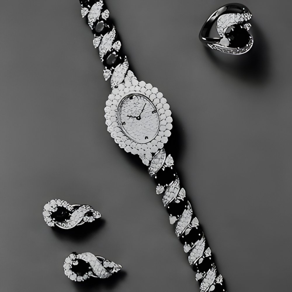 A dazzling jewellery set from Patek Philippe comprising a watch, earclips and a ring. Facetted sapphires and diamonds set in yellow gold. (PATEK PHILIPPE, Geneva)