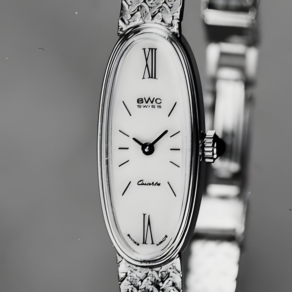The elongated “baguette” line, typical style of the Thirties, is staging a vigorous comeback thanks to the development of appropriately shaped quartz movements. One of these two models features an all-steel bracelet, the other is two-toned. (BWC Buttes Watch Co.)
