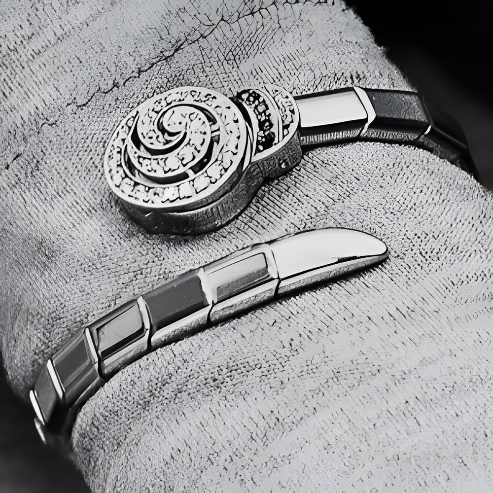 Dubbed “Charleston”, this model is truly reminiscent of the Roaring Twenties. It features a clasp-less, flexible goidpiated bracelet. The watch face hides under a coverlid set with white and red imitation stones. (CONSUL “Charleston”)
