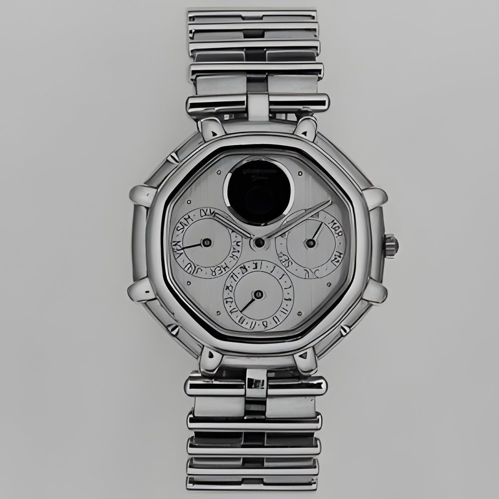 “GOLD & GOLD” : a timepiece whose seifwinding movement features a perpetual calendar with the phases of the moon. The moon is in gold on a lapis lazuli ground. Registered model. (GERALD GENTA, Geneva)