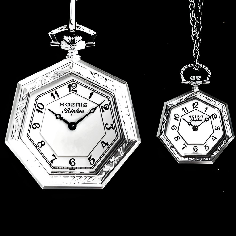 His & Hers pairs now exist in pocket watches too! These seven-sided replicas of late 19th century designs feature broad, hand-engraved bezels in the antique style. Their cases are plated in pale pink gold and the similarly coloured dials display black Arab numerals. With mechanical movements. The lady’s model can also be worn as a pendant. (MOERIS “Replica” Collection)