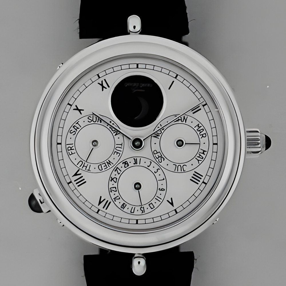 An exceptional accomplishment: this wristwatch has a perpetual calendar (day - date - phases of the moon) and a repeater strike for hours, quarters and minutes. Made to order only, for delivery a year later. (GERALD GENTA, Geneva)