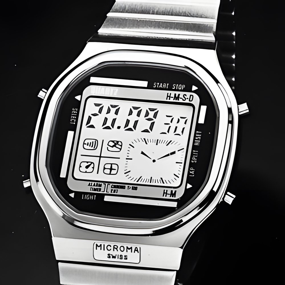 This multifunction timepiece features a solid-state module design, the ESA/EEM 931.771 with combined analog-digital time display, including liquid crystal “watch hands”. The two time readouts are synchronized. Digital functions are: hours, minutes and seconds (or date) - alarm with musical chimes - chronograph to 1/100th sec. - timer - second time zone. Nightlight. The functions selected are indicated by a flashing symbol. A MICROMA model.