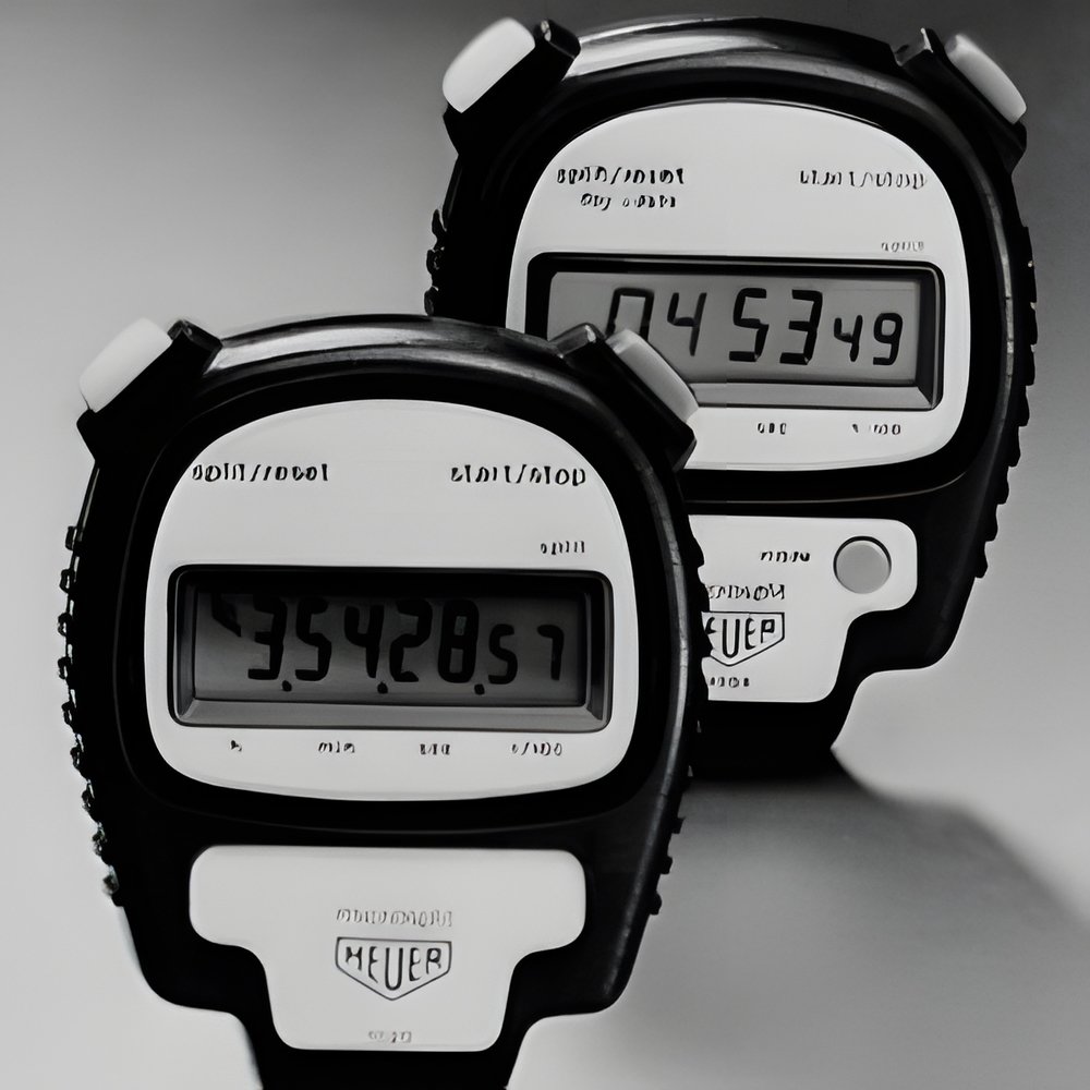 With Switzerland able to draw on long experience in sports timekeeping, a host of new multifunction timers is now coming on the market - here, for instance, is a line featuring large-sized digital readouts, some of which also show the time of day while others have a 9-hour timing capacity. (HEUER)