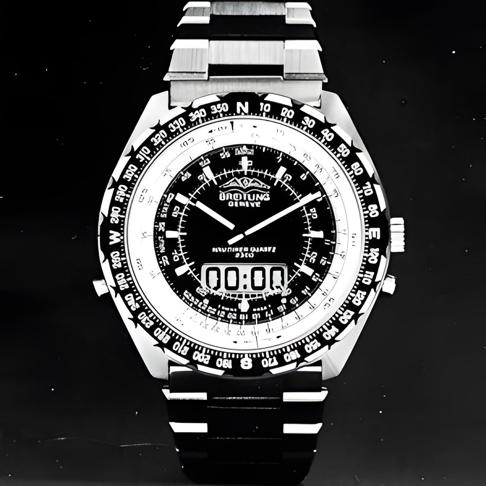 “Jupiter” : the third version of the famed Navitimer pilot’s watch. It is an exact replica of the seifwinding Navitimer model but, here, with a quartz movement adding its own level of electronic precision to this prized navigational instrument. It also benefits from improved legibility and a more functional design. (BREITLING “Navitimer-Jupiter”)