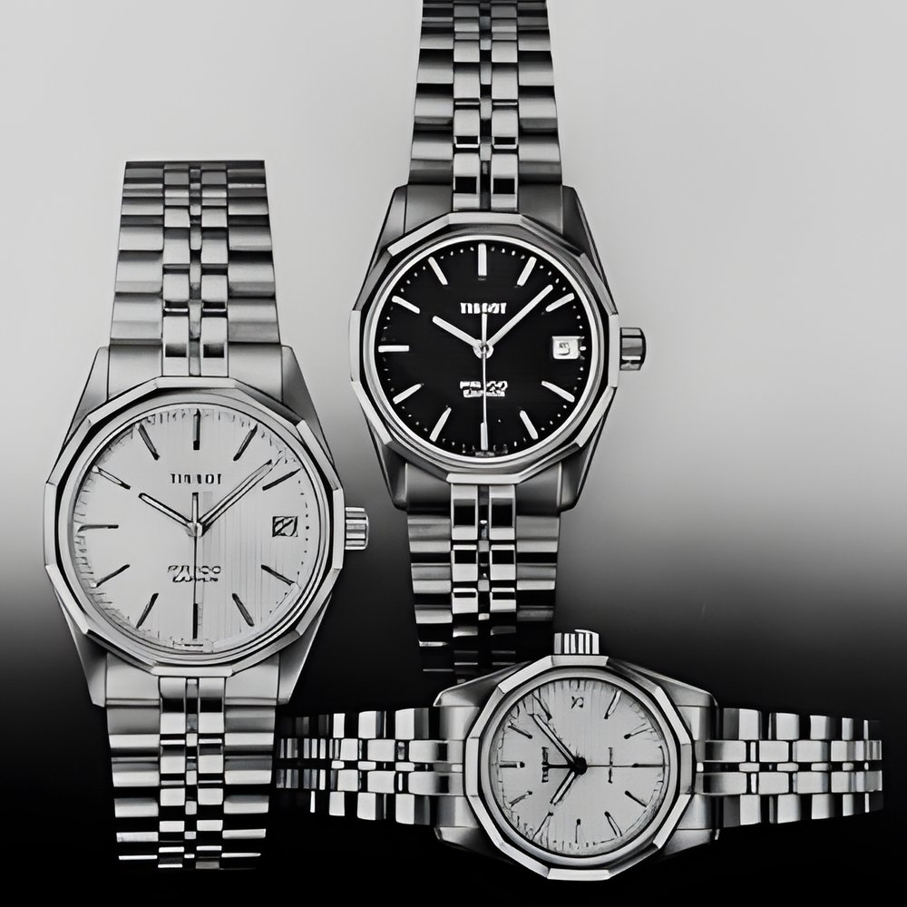 The new generation of Tissot’s PR-family: water-resistant down to 100 meters, screwed-down crown, double case back, scratch-resistant sapphire crystal. Fitted with the new extra-thin quartz movement Flatline II (2.50 mm thin) with centre seconds and date. Available in three sizes, in steel, bicolour or goldplated. Bracelet in solid stainless steel. (TISSOT PR 100)