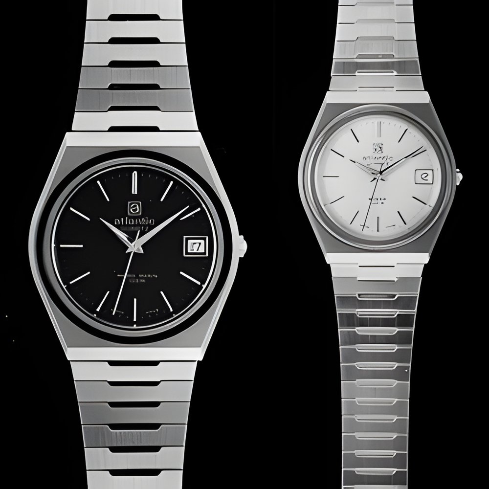 Atlantic introduces its “Midas Marin” designs : rugged, well-protected yet stylish sports watches. Cases, made of a titanium alloy (1,600 on the Vickers hardness scale), are water-resistant to a depth of 100 m (special gaskets and screw-lock crown). Equally scratch-resistant goldtoned titanium-alloy cases are also available. Sapphire crystal, quartz movement with centre seconds and calendar. (ATLANTIC “Midas Marin”)
