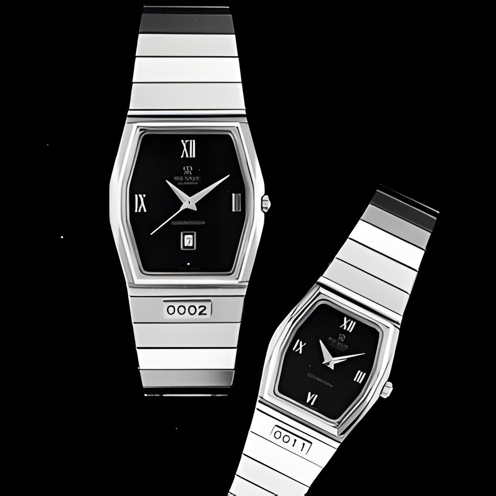 Extra-slim quartz watches (Flatline III movements) displaying exclusive proprietary designs. Their steel or goldplated cases, with scratchresistant sapphire crystal, are water-resistant down to 30 m. They form a limited edition, with a serial number on the bracelet, itself with invisible clasp. (REVUE “Countach”)