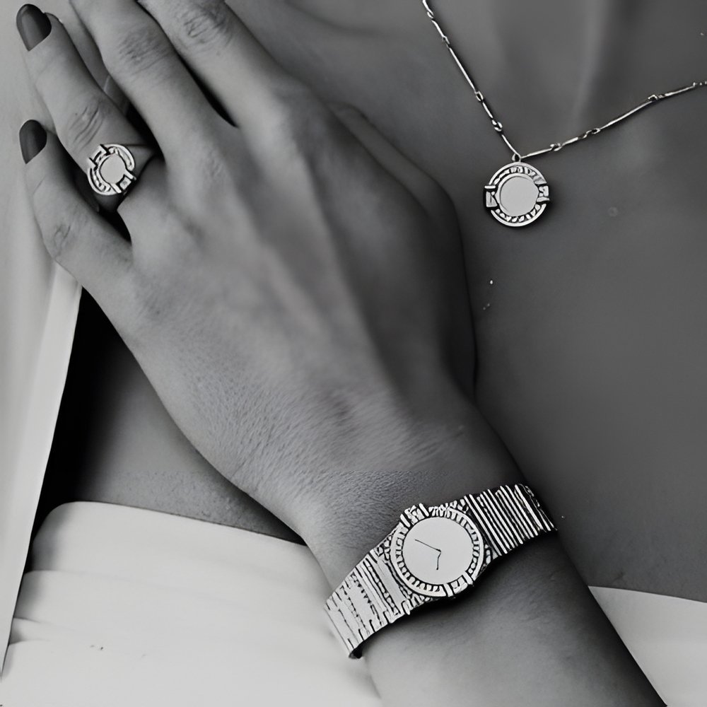 Omega Constellation jewellery suite with two-tone setting in 18K pink and white gold. The bracelet watch, featuring Omega’s well-known “claws”, features 546 brilliant-cut diamonds including 245 on the dial. Sapphire crystal with inalterable 24K gold metallisation. Quartz movement protected by a case water-resistant down to 30 m. The white and pink gold earrings, pendant and ring are also set with diamonds. The latter two can be personalised by a monogram or a precious stone. The set carries a total of 622 diamonds weighing 3.87 carats. (OMEGA “Constellation”)