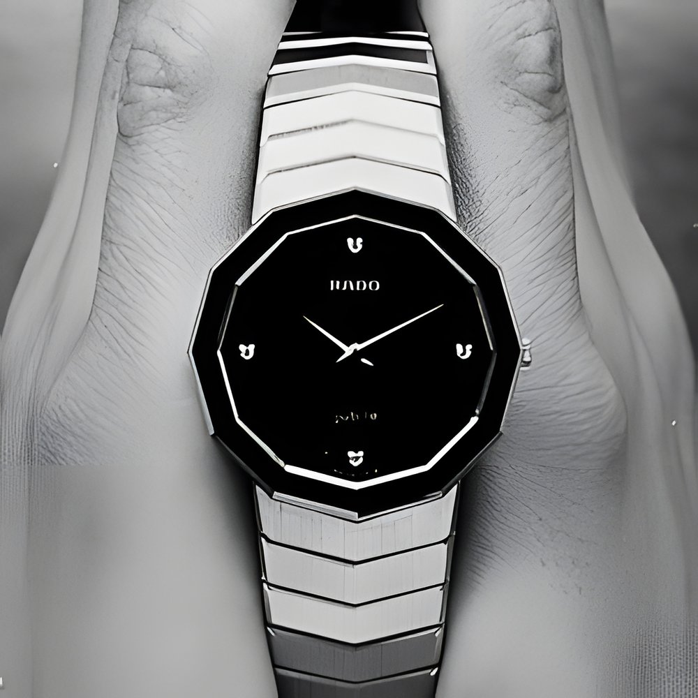 Rado’s latest design, the “DiaStar Jubilé” model: extra-slim yet water-resistant case, two-tone hard-metal scratch-resistant bezel framing a black dial with four diamonds. Two-tone steel bracelet. Quartz movement. (RADO “DiaStar Jubilé”)
