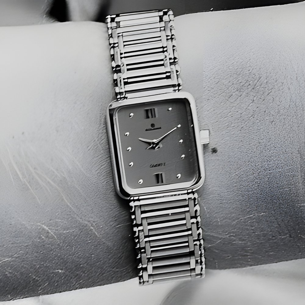 Designed by horological craftsmen, this model is fitted with an extra-thin (1.95 mm) ETA Swiss Quartz movement. Made in goldplated or two-tone styles. Men’s models are also available. Note the very supple Land comfortable bracelet composed of tiny cylinders. (GOLANA)
