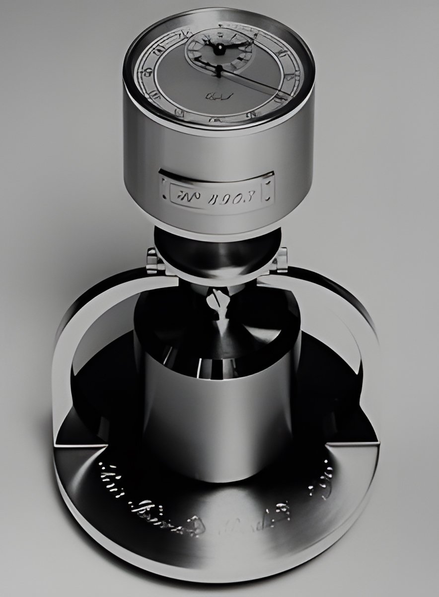 A replica of a unique timepiece: a ship’s chronometer built in 1796 by Swiss master watchmaker Ferdinand Berthoud. Dial with off-centred hour and minute hands and centre seconds hand. Case in polished steel and brass, faithful reproduction of the original gimbal suspension, with counterweight. It is fitted with an Imhof 4-MHz quartz movement having earned an official Chronometer Certificate. The original of this admirable timepiece is in La Chaux-de-Fonds’s International Watchmaking Museum. (IMHOF)