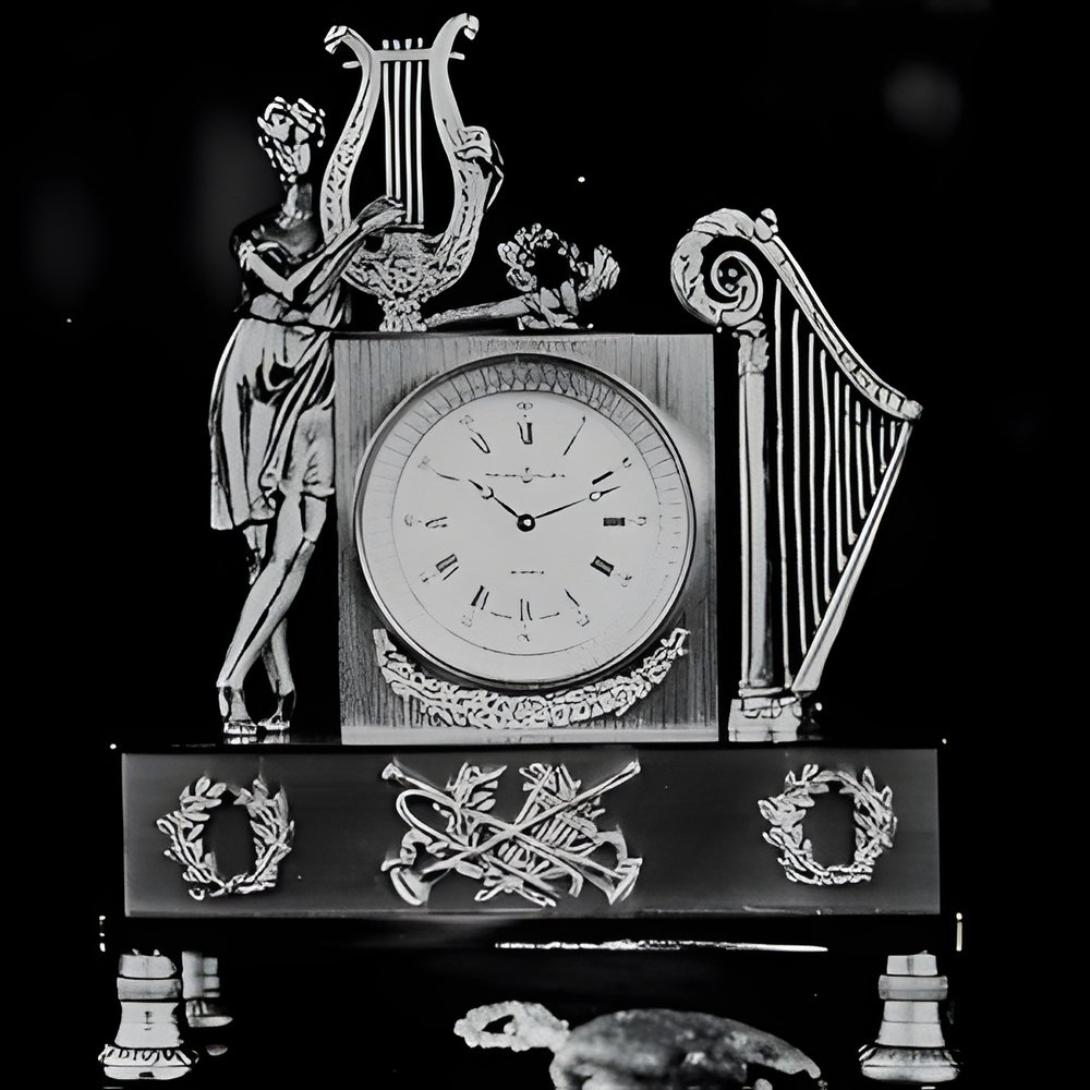 Handsome replica of a 19th century model: a Charles X style quartz clock. Plays an air every hour on a 28-blade two-air mechanism. The music can be started and stopped at will. Gilt brass case with gilt bronze ornaments. Dim.: 20.5 x 16 x 8 cm. (REUGE)