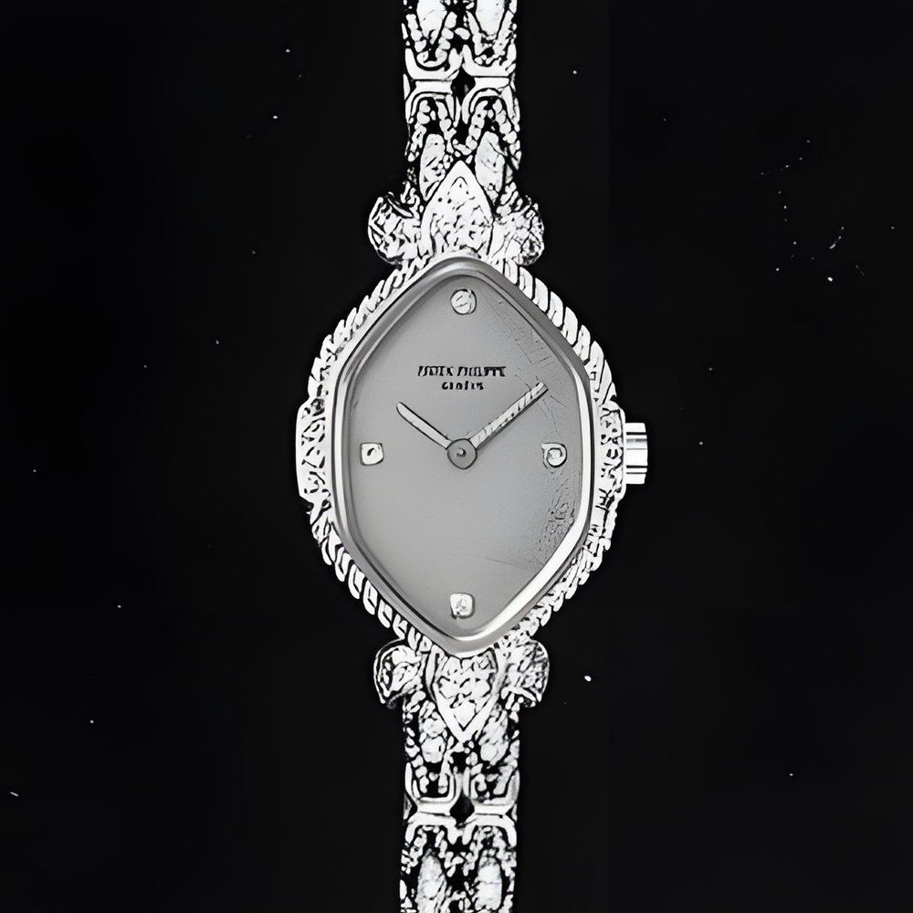 A prestigious creation designed by Patek Philippe for a dainty wrist. Slim, twin-strand bracelet, geometric case with engraved bezel. In 18K yellow gold set with about 0.82 carat of diamonds. (PATEK PHILIPPE Geneva)