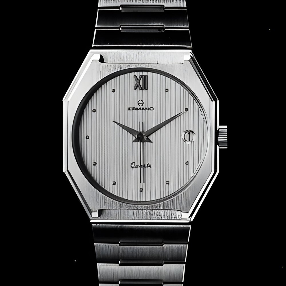 For sports, town and country and evening wear too : the all-purpose, ever stylish timepiece. Quartz movement with centre seconds and calendar. Extra-slim water-resistant case, goidpiated or two-tone, mineral crystal. (ERMANO)
