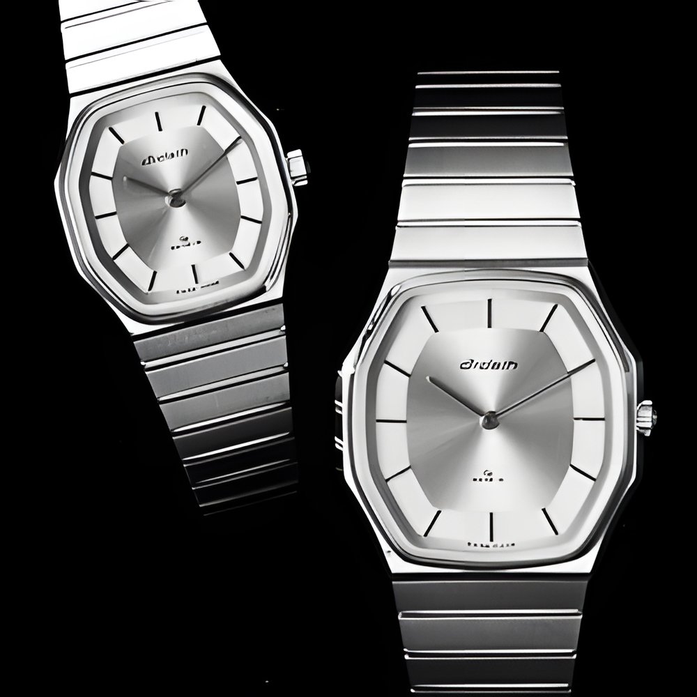 Two crisply styled Ardath timepieces: all-steel water-resistant cases with a yellow goidpiated bezel to underline their eightsided design. Very supple two-tone steel multiplated bracelet. Two-tone dial. Flatline Swiss Quartz movements. (ARDATH)