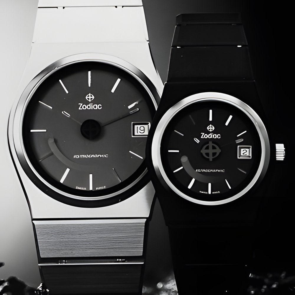The sports watch for today: quartz-piloted, extra-slim yet rugged and water-resistant to a depth of 30 m. All-steel case and bracelet with black overlay or black overlay with yellow goldplate bezel. The seconds are indicated by an “orbiting” red dot. With calendar. (ZODIAC “Astrographic”)