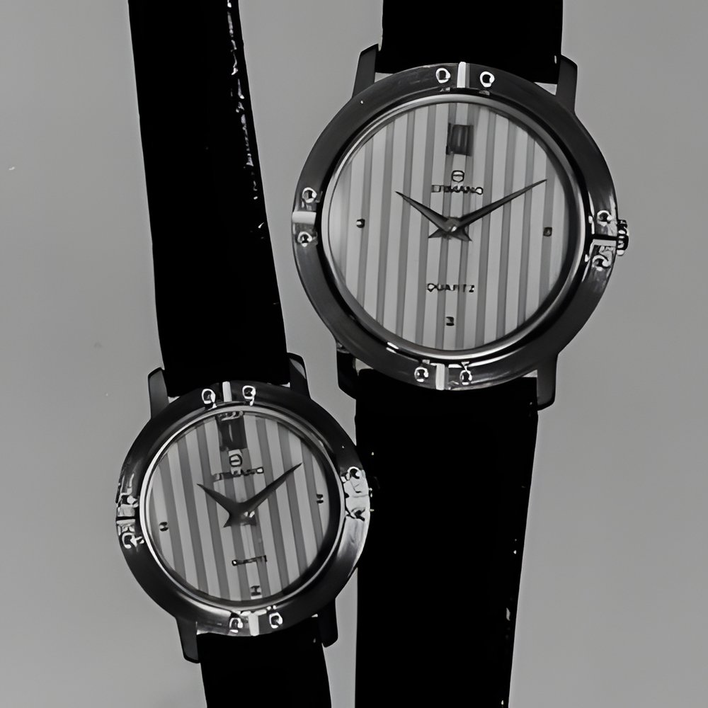 This pair of quartz watches with two-tone styling is typical of today’s “fashion watch look” : slim-line stylishness at very affordable prices. Mineral crystals. (ERMANO)