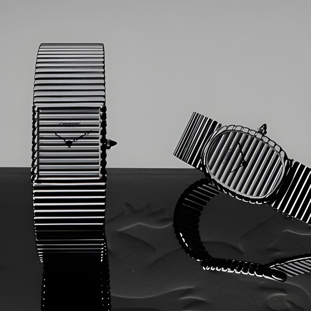 Two men’s models from Leonard Genève’s new collection in 18K yellow gold. Highly supple “Tube” bracelets composed of small sections of gold tubing assembled and fitted together by hand. Yellow gold dials and crowns, the latter tipped by a tiger’s eye. Extra-thin 9-line movements. Feminine versions of these models, with a quartz movement, are also available. (LEONARD Geneva)