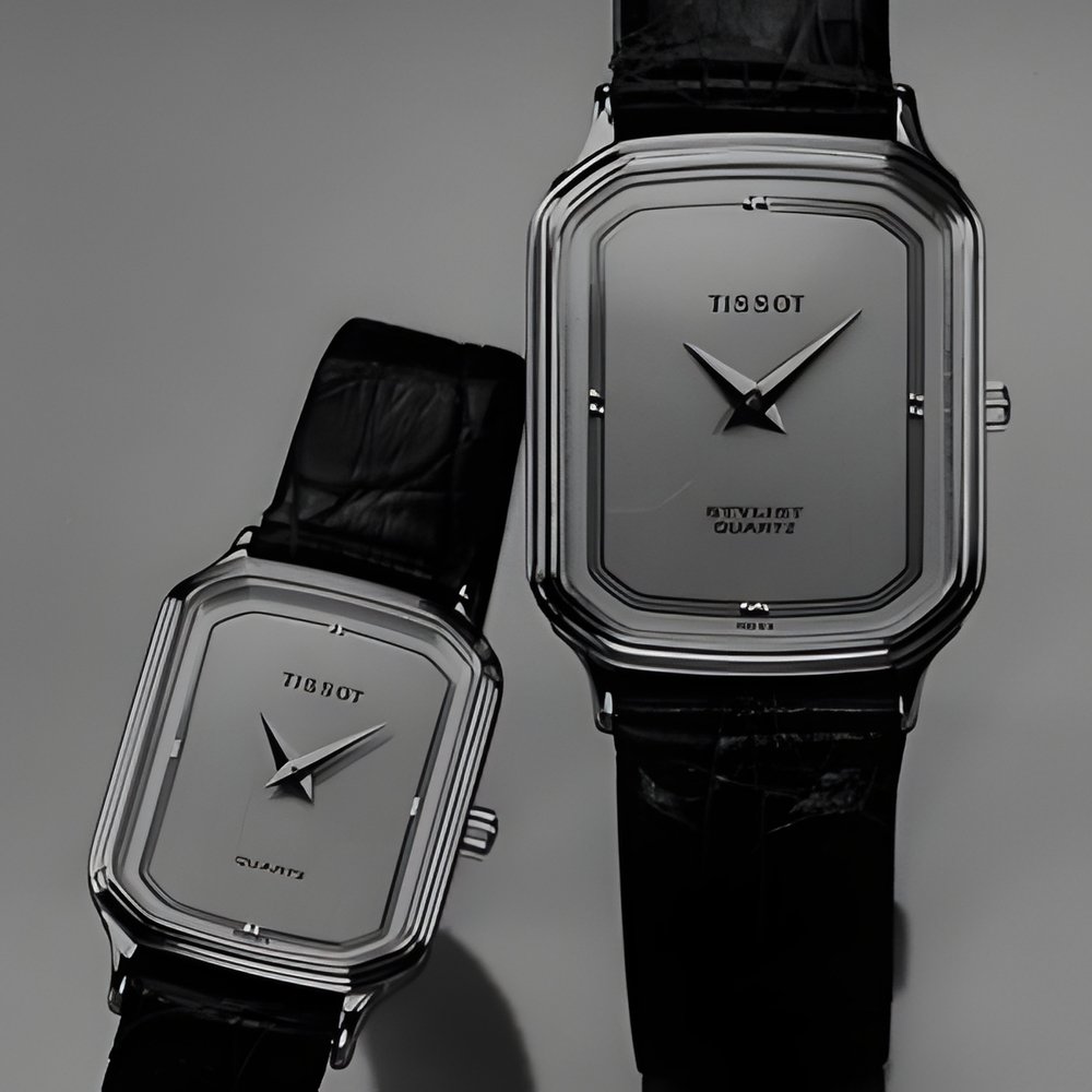 From Tissot’s new Stylist Collection, a His & Hers pair in goldplate or two-tone styling, fitted with an extra-thin quartz movement. Wide choice of discreetly textured dials. Genuine alligator strap. (TISSOT “Stylist”)