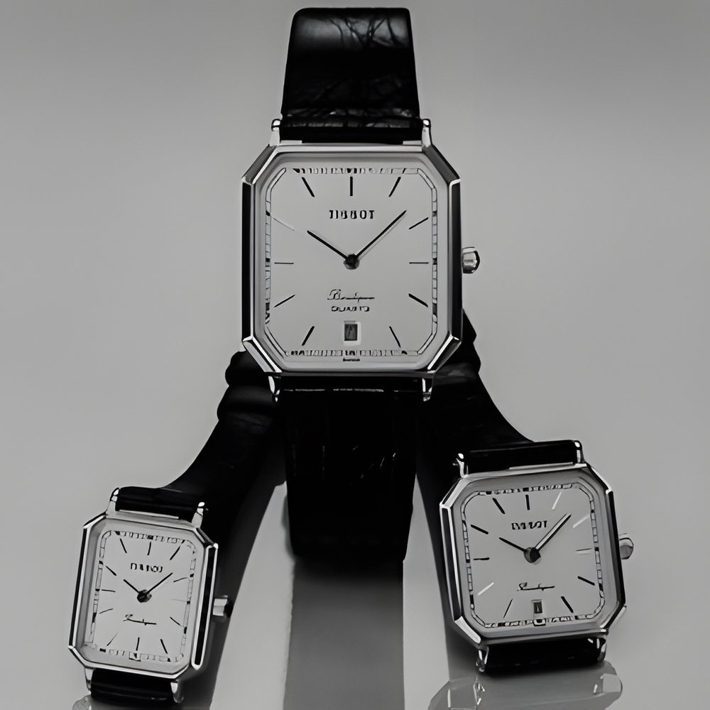 These Tissot Boutique models are made in three different sizes, all with facetted cases decorated in a choice of lacquer colours. The two larger sizes feature a quartz movement with calendar. Genuine alligator strap. (TISSOT “Boutique”)