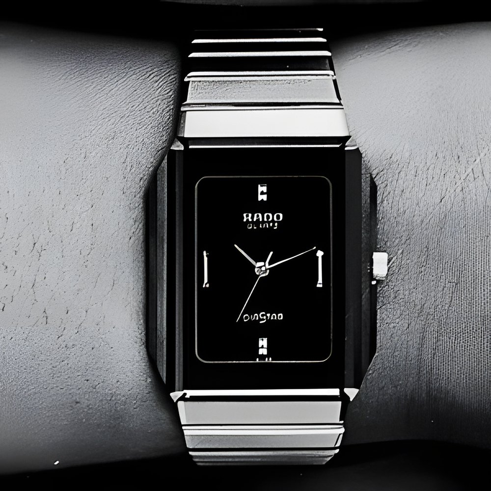 Crisp, modern lines set off this new Rado DiaStar design with scratchproof case - probably the first ever of this kind with two-tone styling, in grey and yellow hard metal. Scratchproof sapphire crystal, steel bracelet fitted with a new safety clasp system. Quartz movement. (RADO - DiaStar)