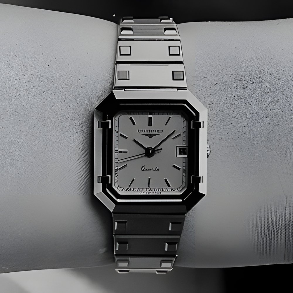 Very handsome, ultra-slim, with the self-assured gleam of hard metal. This Longines XL design features a case made of “TuG” : tungsten, nickel and chrome carbide heated without fusion to 1,500°C and then polished with diamond powder. Extra-thin quartz movement with centre seconds and calendar. Water-resistant to a depth of 30 m. Scratchproof sapphire crystal. The steel bracelet is elegantly protected with plates of gilt “TuG”. (LONGINES “XL Collection”)