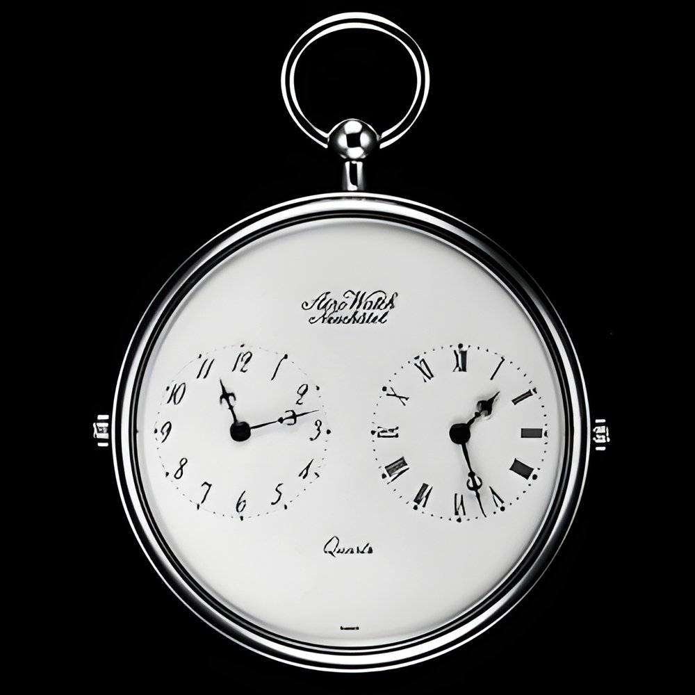Pocket watch sales increased 15% from 1983 to 1984. Here an Aero model showing the time of two time-zones. Dials with Roman and Breguet figures, studded minute-track. Yellow goldplated case. Two 5 1/2“ETA quartz movements. (AERO WATCH”Duo Time")