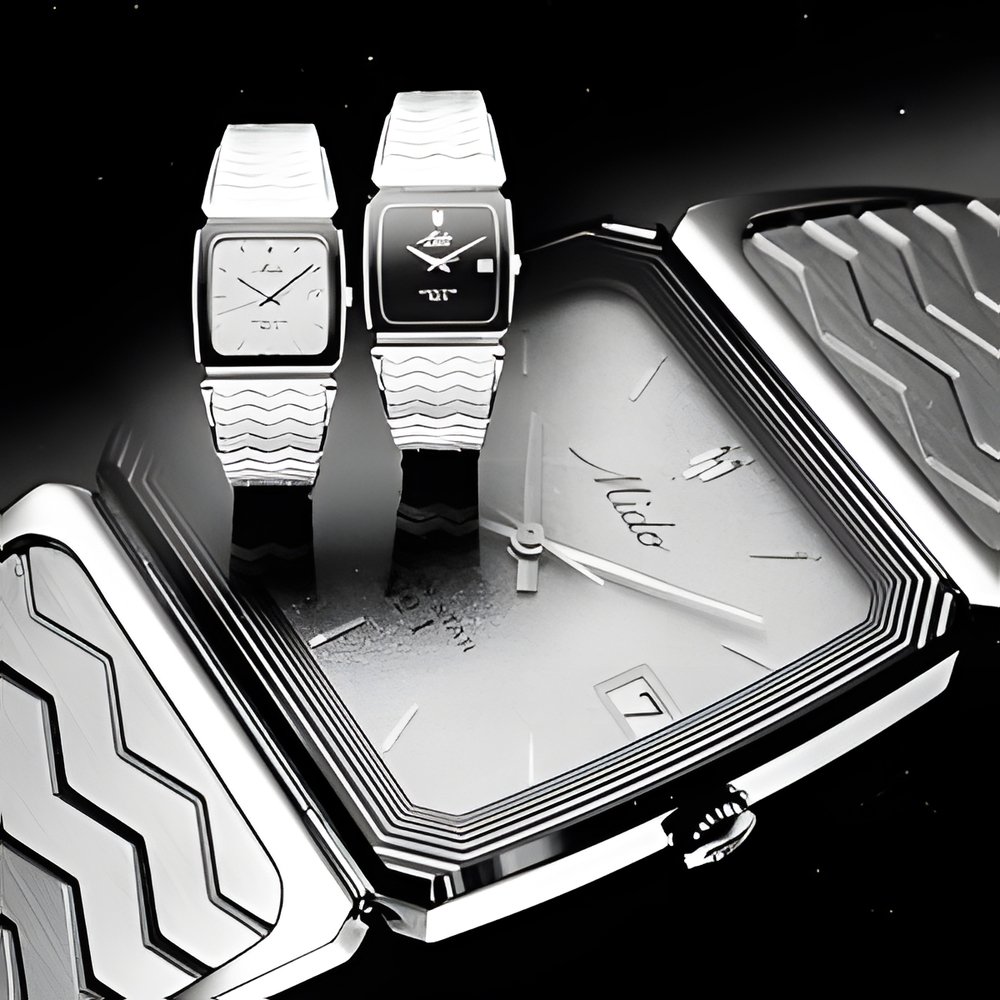 A watch of striking difference - the new Mido Ocean Star no 1. Invisibly secured, the sapphire crystal covers the case top completely, assuring efficient protection. Of particular interest, the stirrupshaped flexible link connecting the solid Chevron bracelet to the sapphire/steel case. The watch also features Aquadura long-life watertightness system and a new, very slim Swiss quartz movement with second and date. (MIDO)