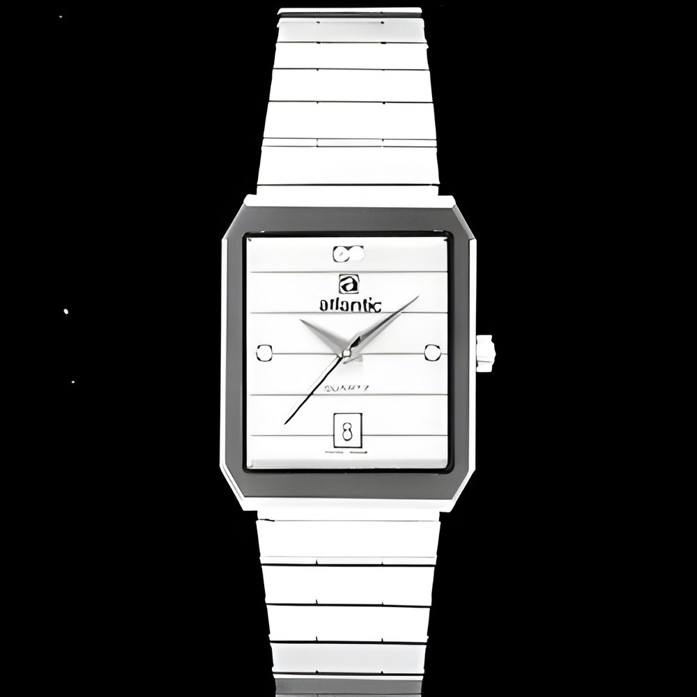 This extra-slim quartz watch, protected by a scratch-resistant case made in titanium carbide as well as by a sapphire crystal, is water-resistant to a depth of 40 metres. Centre seconds and date calendar. (ATLANTIC “Midas Cameo”)