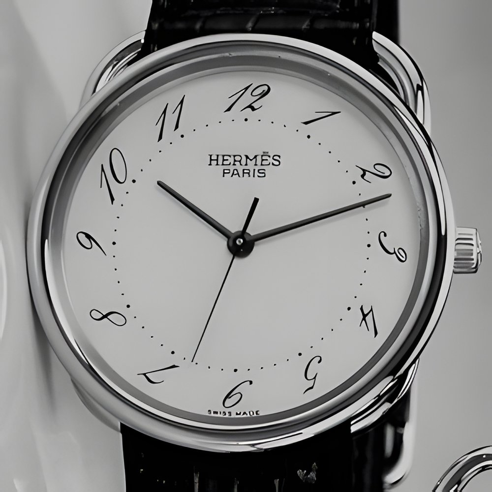 The collection’s flagship model, the «Arceau» is quintessentially Hermès. Both its classic design and refined slanted numerals contrast with its asymmetrical horseshoe-shaped upper attachment. Available in three sizes, it comes in steel, steel/18K gold, or 18K gold, with a leather strap or metal bracelet. Water-resistant to 30 m, it has a quartz movement and a sapphire crystal.