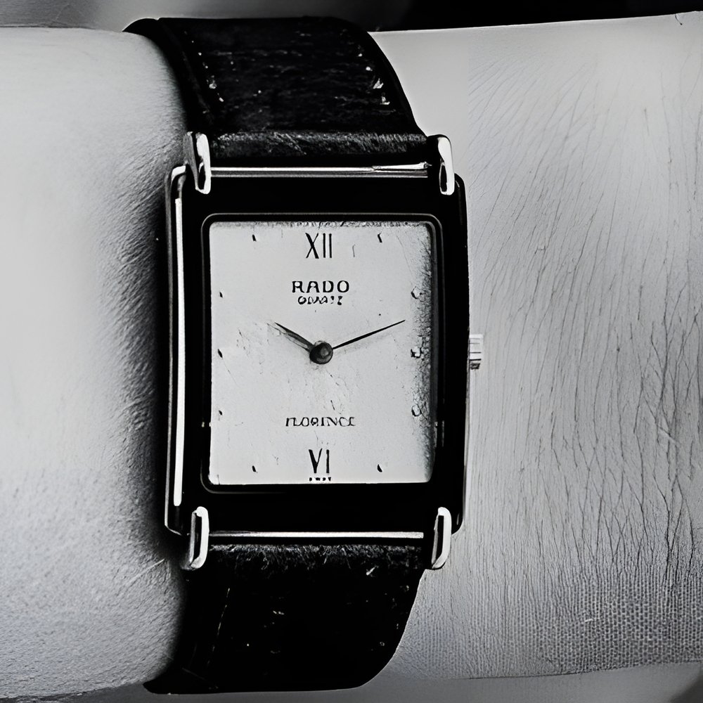 This new Rado model is protected by a large convex, scratch-resistant, sapphire glass. Diamond polished on both sides with metallised rim. Extra-thin quartz movement, water-resistant case in gold plate with steel back. (RADO Florence “Anatom”)
