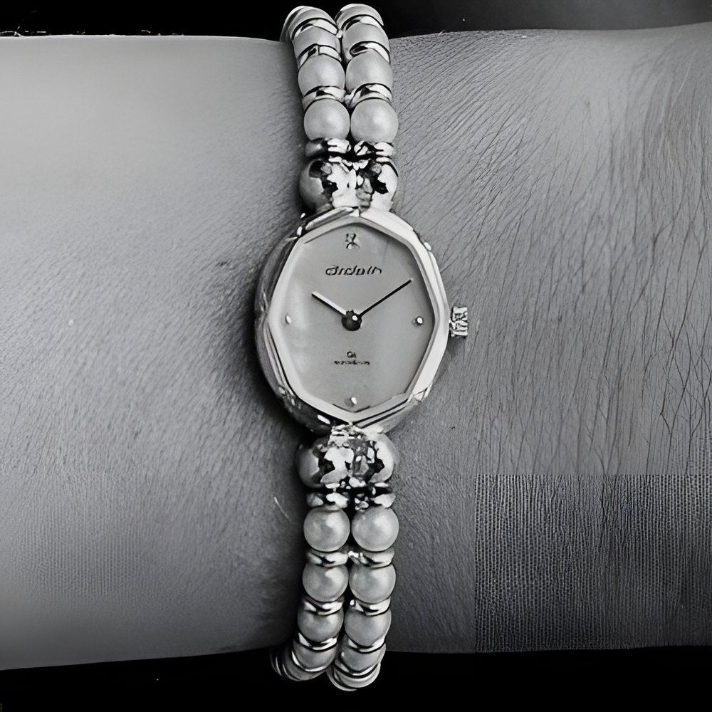 Soft, curved lines for this fashionable lady’s watch. Yellow goldplated case, water-resistant, scratch-resistant sapphire crystal. White pearl bracelet with imitation or cultured pearls. Extra-thin (ETA Flatline) quartz movement. (ARDATH, Geneva)