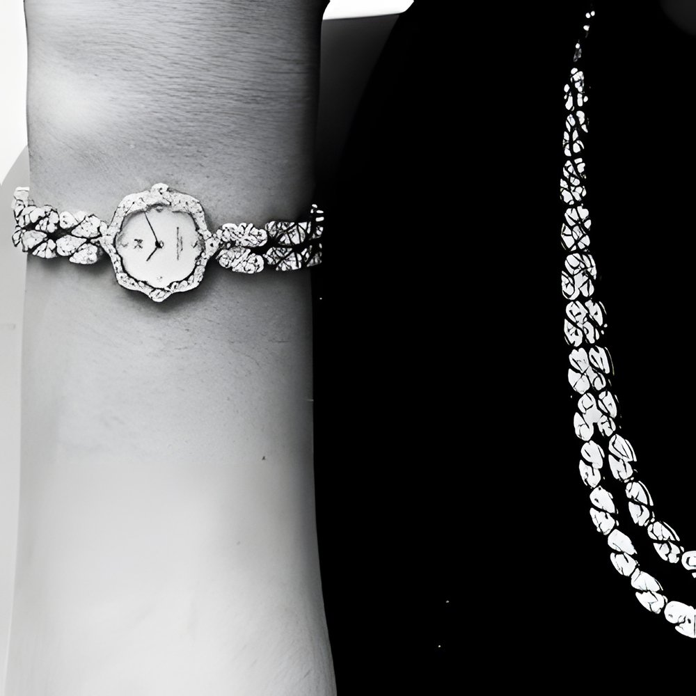 Necklace, earrings and wristwatch made of tiny leaves of 18K yellow gold, studded with 33 carats of full-cut diamonds. The earrings are finished with large white pearls. Note the curved lines of the wristwatch case. (GMT GOLD COLLECTION)