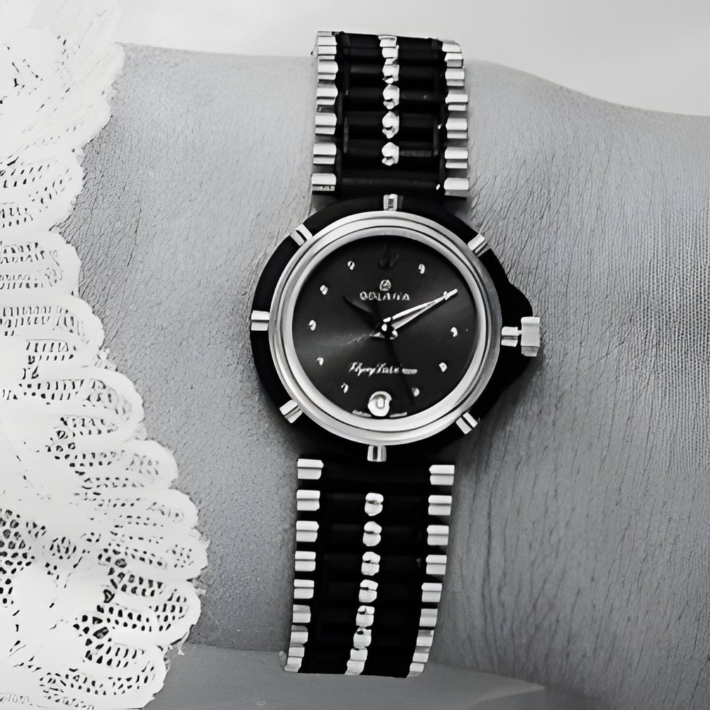 Stylish and sporty, this Golana quartz watch, made in palladium and yellow goldplate or in black chrome and yellow goldplate, features a bezel with “rudder” ornament, an extremely supple and adjustable integrated bracelet, of “multitube” type, and a mineral crystal. The man’s version is also available. (GOLANA)