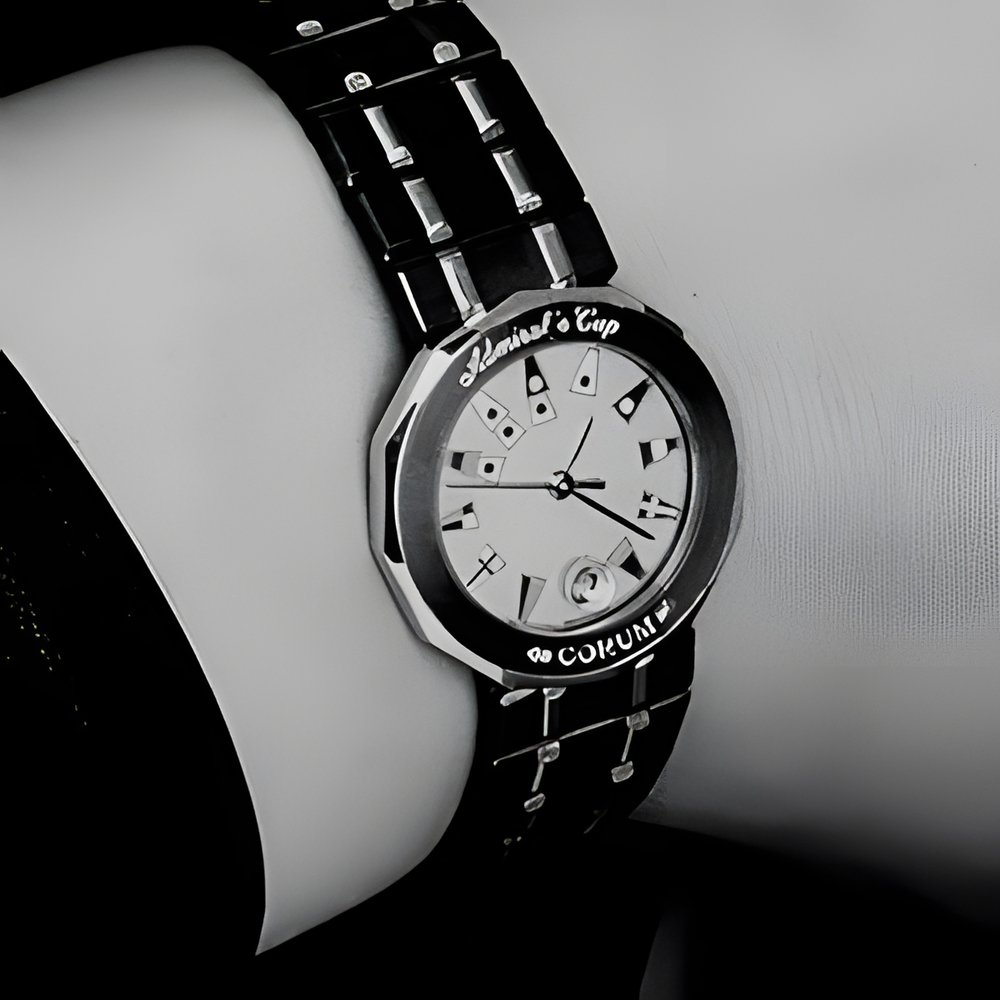 The typical “Admiral’s Cup” model by Corum in a blue steel and 18-carat gold version. Sporty, water-resistant, quartz movement. For men and women. The enamelled dial indicates “nautical hours” according to the numerical code used by the sea service. Registered trademark. The name “Admiral’s Cup” has been approved by the Royal Ocean Racing Club, London. (C0RUM)