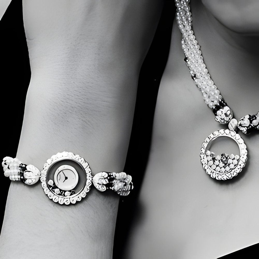 Pearls, rubies and “Happy Diamonds” grace this dazzling, very feminine watch. Its 18K gold case carries 110 diamonds while under its sapphire crystal three more diamonds and three rubis frolic with the wearer’s every gesture. The bracelet features pearls and rubies. With quartz movement. 83 diamonds grace the matching choker. Inside the pendant move 15 more diamonds and 5 rubies. (CHOPARD GENEVE “Happy Diamonds”)
