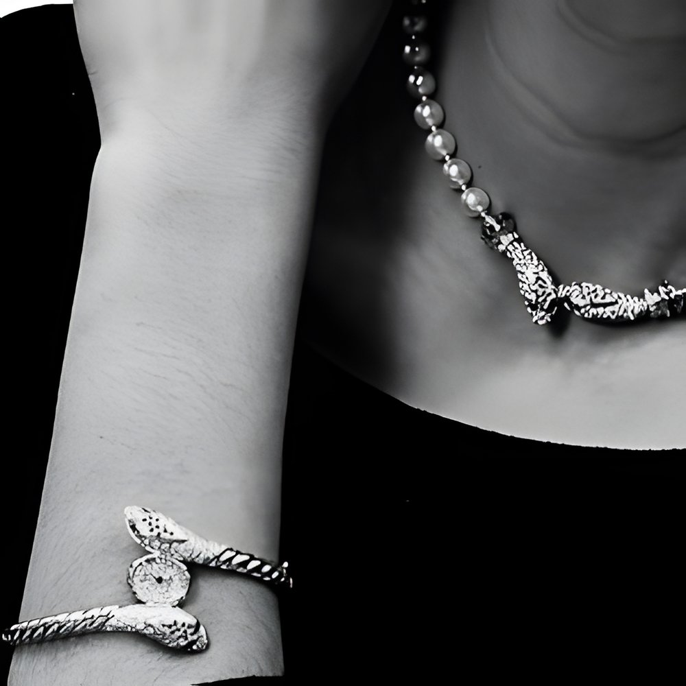 Jewellery “serpent” set comprising a pearl necklace ending in a pair of stylized intertwined serpents and a matching wristwatch. The set features 3.20 carats of diamonds, 1.00 of emeralds and 0.80 of rubies. (GMT GOLD COLLECTION)