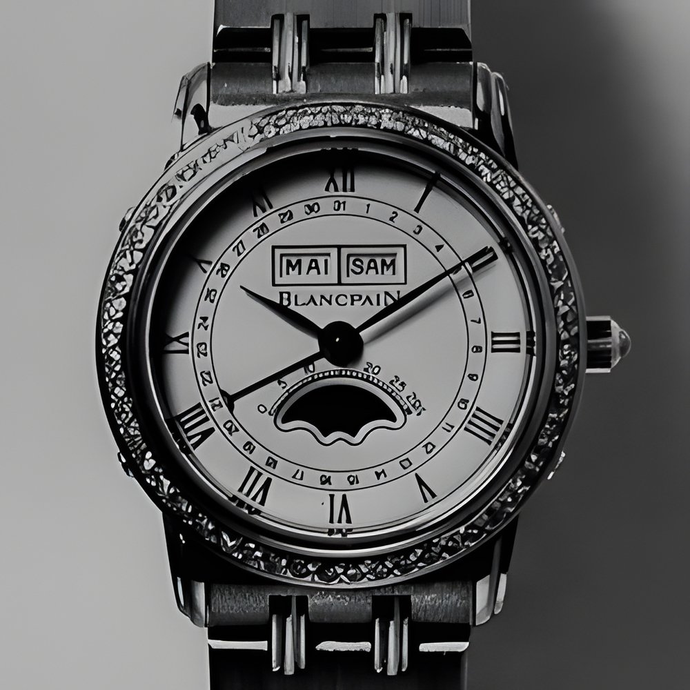 The only wristwatch for women with a self-winding movement and a complete calendar : date, day, month and moon phases. Case in 18K gold and steel. Bezel set with 54 diamonds. The 9-line movement is onl 3.2 mm thick. (BLANCPAIN)