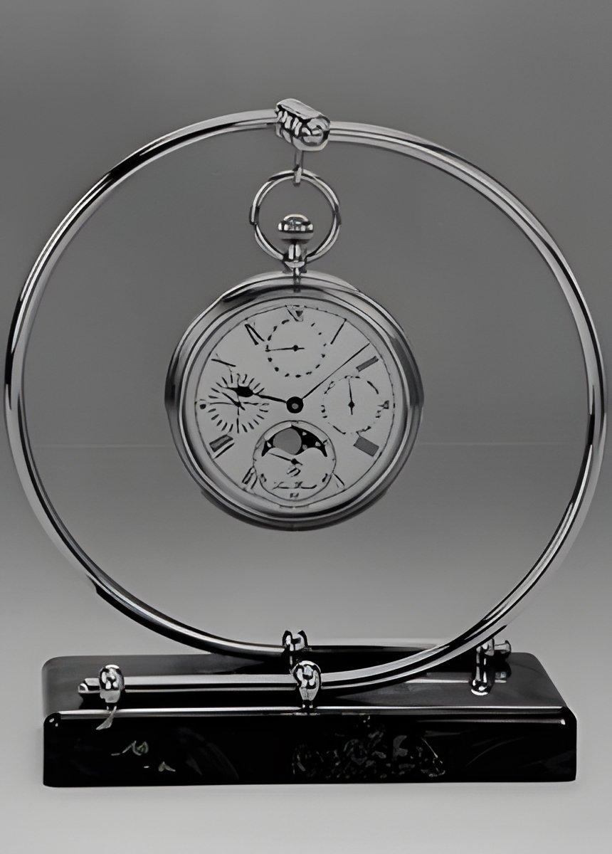Day, date and month... set until the year 2100. Plus the phases of the moon. A salute to the grand tradition in watchmaking, this pocket watch features a visible movement shielded by a scratchproof sapphire see-through case back. It comes with a stylish and ingenious watch holder. (OMEGA - LOUIS BRANDI)