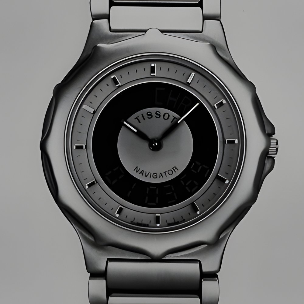 Tissot “Navigator Dichroid”, a sensational novelty. 8 digital functions can be displayed in the dark (round) part of the dial, but are visible only if in use. All functions easily selected from the crown : chronograph, alarm, timer, second time-zone, calendar, etc. Case waterresistant to 20 m, in steel goldplate or two-tone. Scratchproof sapphire crystal. (TISSOT “Navigator Dichroid”)