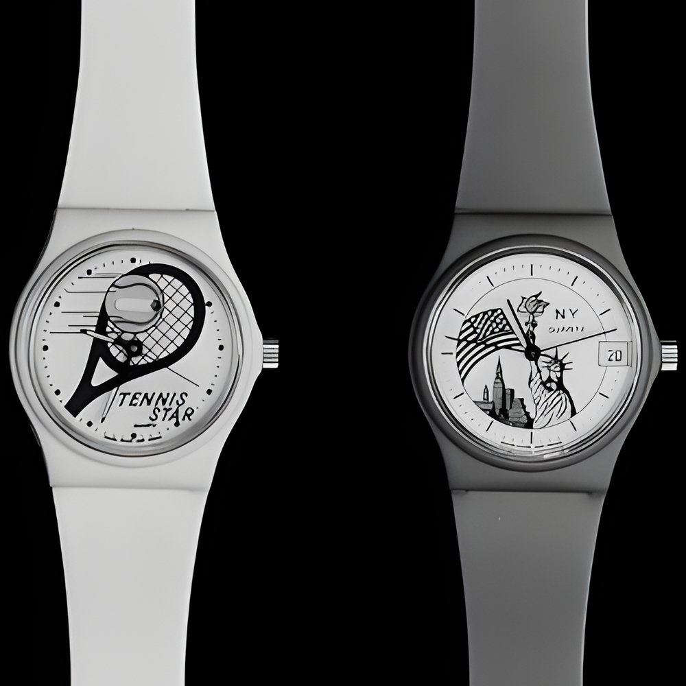 To honour the Statue of Liberty’s one hundredth birthday, Cimier has designed a quartz watch fitted with a patented, mobile dial decor. On this model, it successively “lights” and “douses” the Statue’s torch, in step with the seconds. On another, a tennis ball seems to bounce on its racquet. (CIMIER)