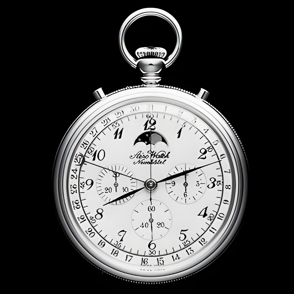 Specialist pocket-watch manufacturer Adro Watch is introducing a new 1/5th second chronograph design in Basle this year. This model features hour and minute timers, a small second hand positioned at 6 o’clock, a circular date calendar and a moon-phase indicator. Goldplated case and enamel-style dial. (AERO WATCH)